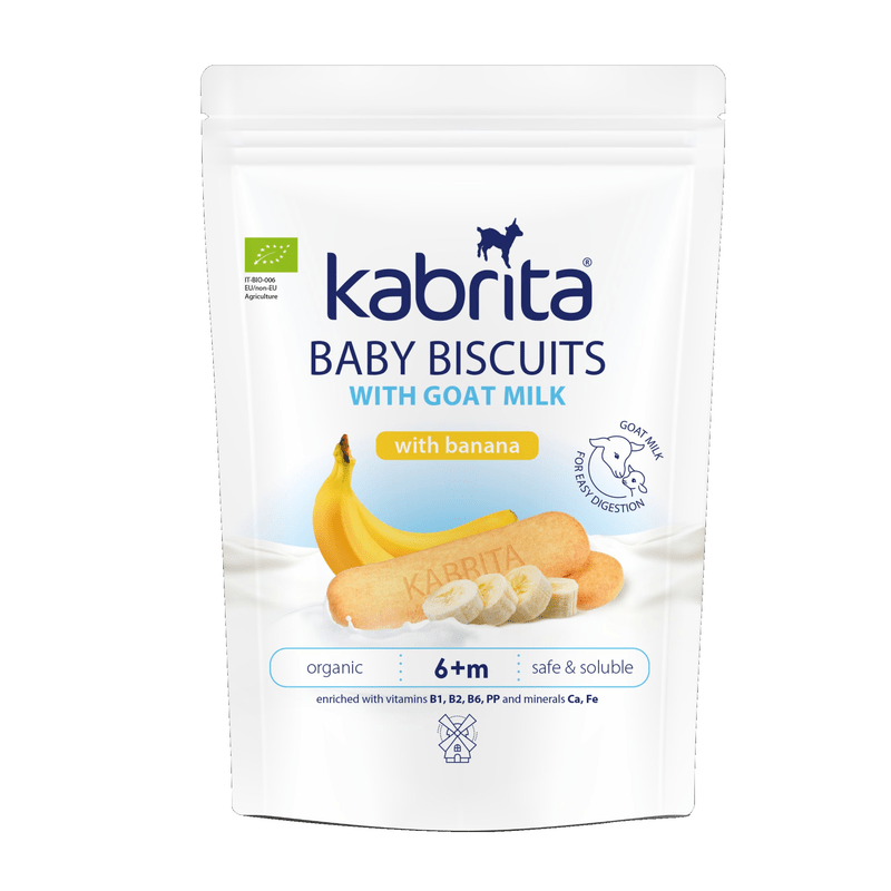 Introduce a naturally gentle and flavorful snack with Kabrita Baby Biscuits with Banana and Goat Milk—specially crafted for babies from 6 months and up. Made with A2 goat milk and real banana, these soft biscuits offer a mild, naturally sweet taste while supporting your baby’s transition to solid foods.